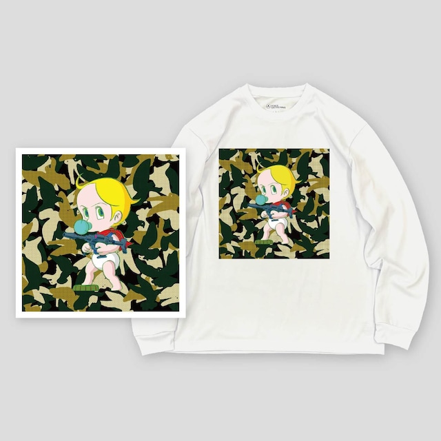 アーティスト名:手島 領 作品名:「Camouflage Peace」 ■作品テーマ コロナ禍や戦争といった危機的状況下でも新たに生まれる命があり、その命が危機にさらされる現実に深い憂いを感じています。作品の中心にいる「BABYBOY」は、そんな今という時代に生まれた赤ちゃんのヒーロー。彼は“希望の象徴”であり、次世代の命を守るために立ち上がった“赤ちゃん戦士”という設定。このキャラクターを通じて、たとえ死の隣であっても産まれる命の尊さや未来への願いを描き出しています。 ・前後でプリント位置を選んでいただけます。 ▼サイズ・プリント位置を選択して下さい▼
