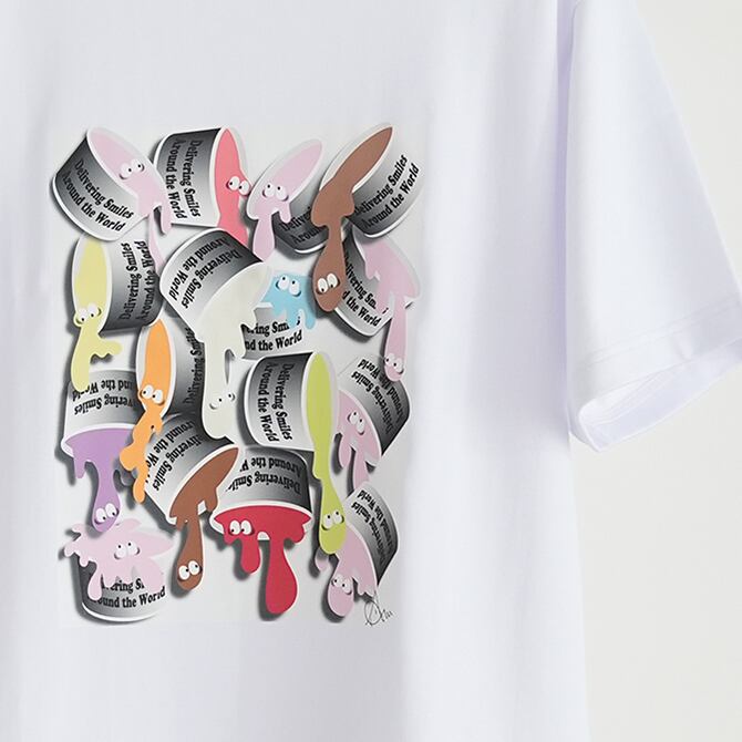 『#世界中にスマイルのお届け』の名の下に働くアイスクリーム達の慌ただしい活動のイメージイラストです。アイスクリームとスマイルという2つの幸せ共通言語で世界中みんなが笑顔になれたらいいなというシンプルでキャッチーなメッセージアートです。