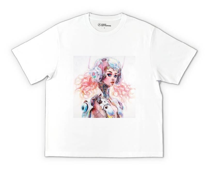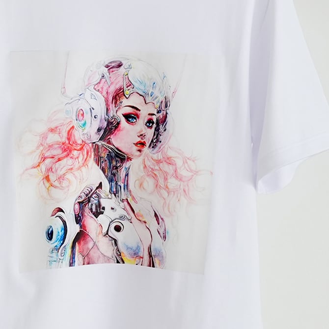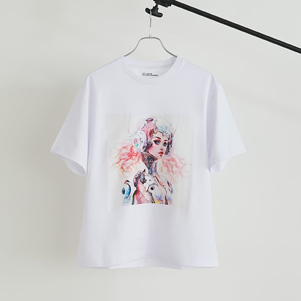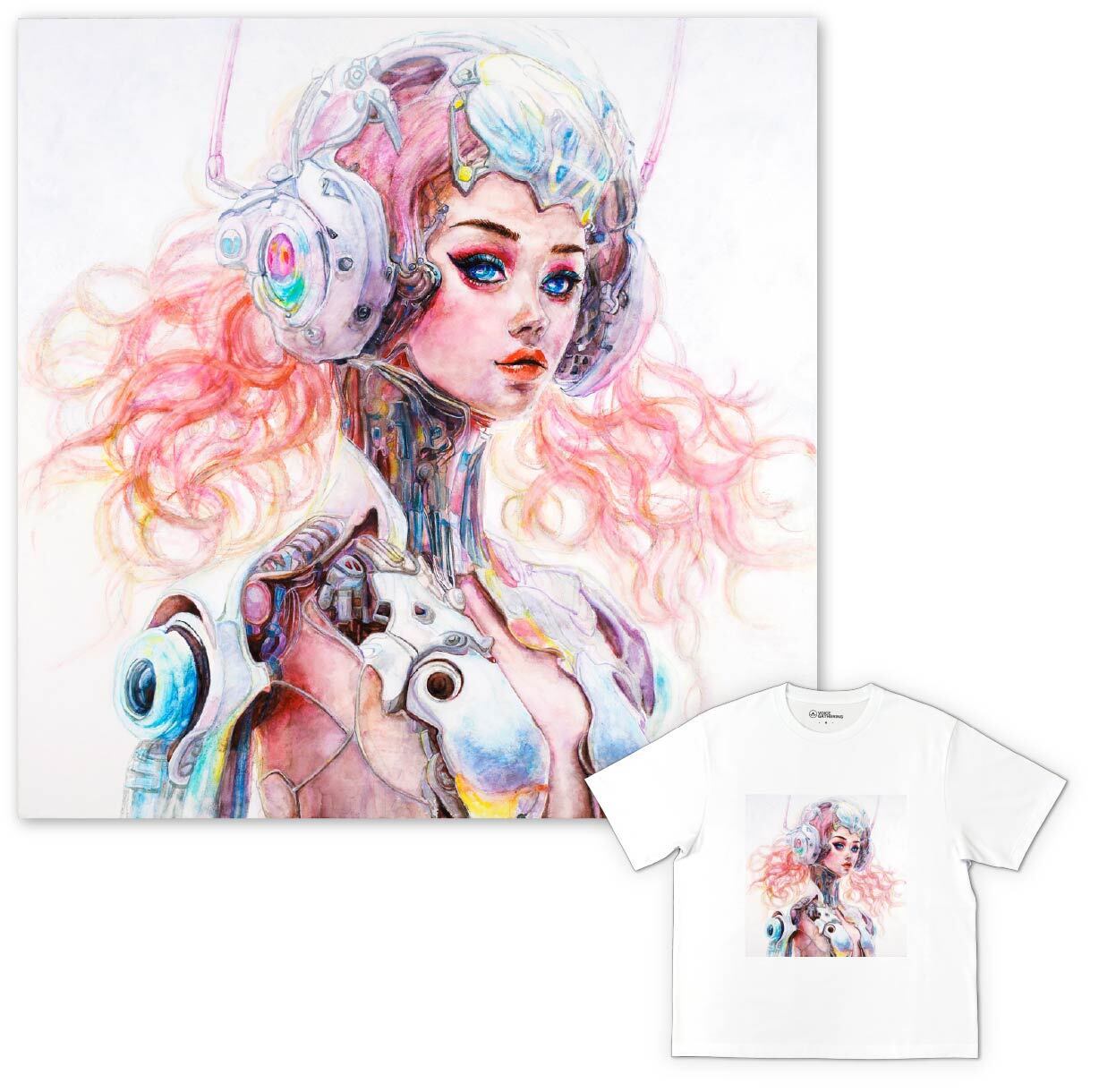 無機質な機械美と有機的な女性らしさを、透明水彩で繊細に融合させることで、懐かしさと新しさが交差する、神秘的な印象の存在を表現しました。