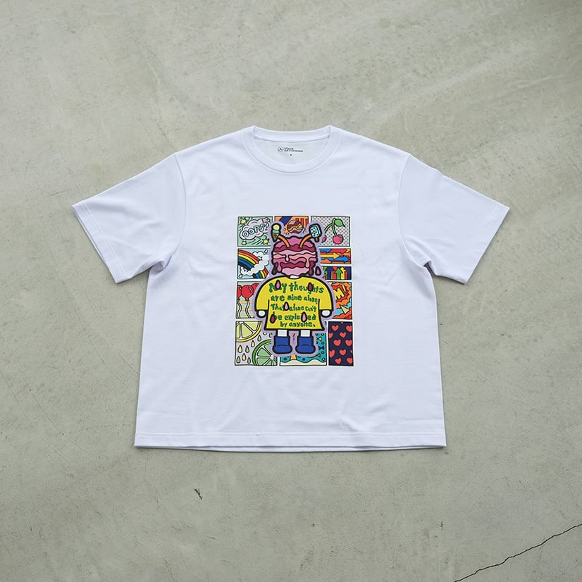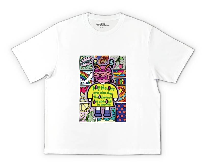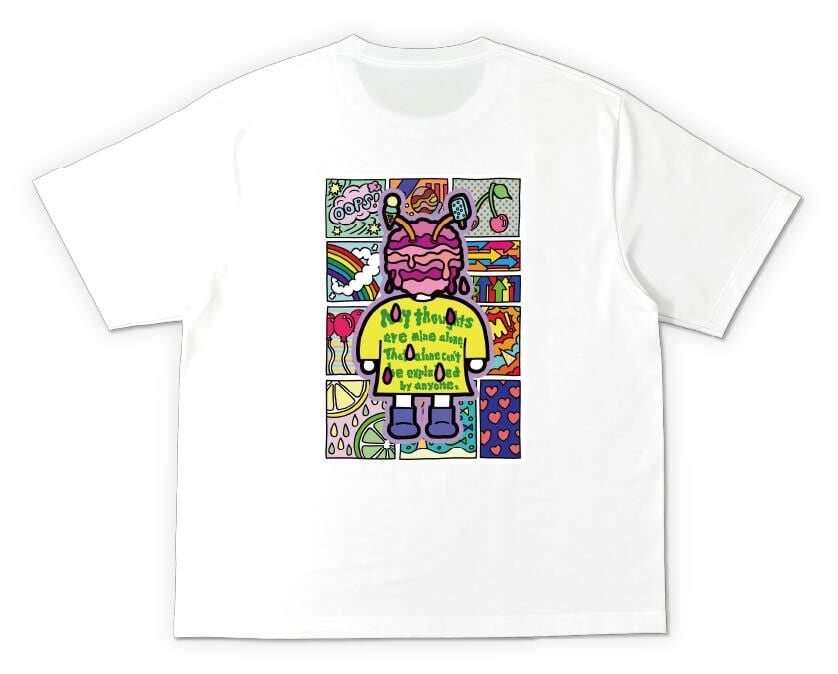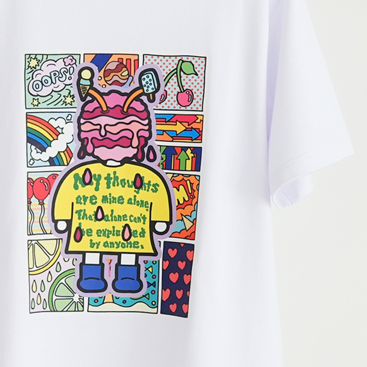 こちらのキャラクターは、POPが脳から溢れてくるというモチーフのキャラクターです。それは私が作品制作をしている過程で、「POPとは何か?」を考え続けるうちに、思考がカラフルでポップなイメージに浸食され、脳内がパンクしそうになるような感覚をヒントに生まれました。このキャラクターは、そうした自身の内面的な混乱や熱狂を反映した存在であり、ある意味で自画像のような存在でもあります。