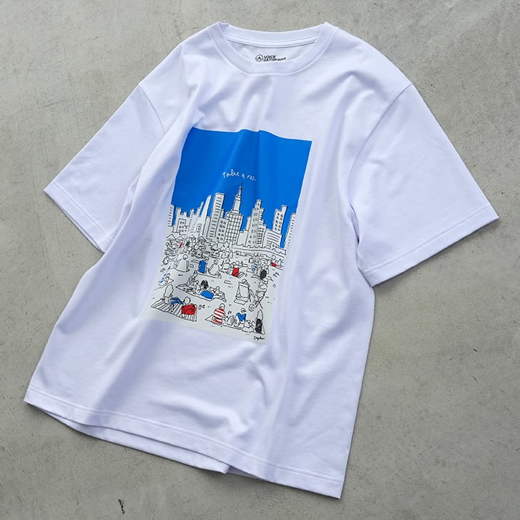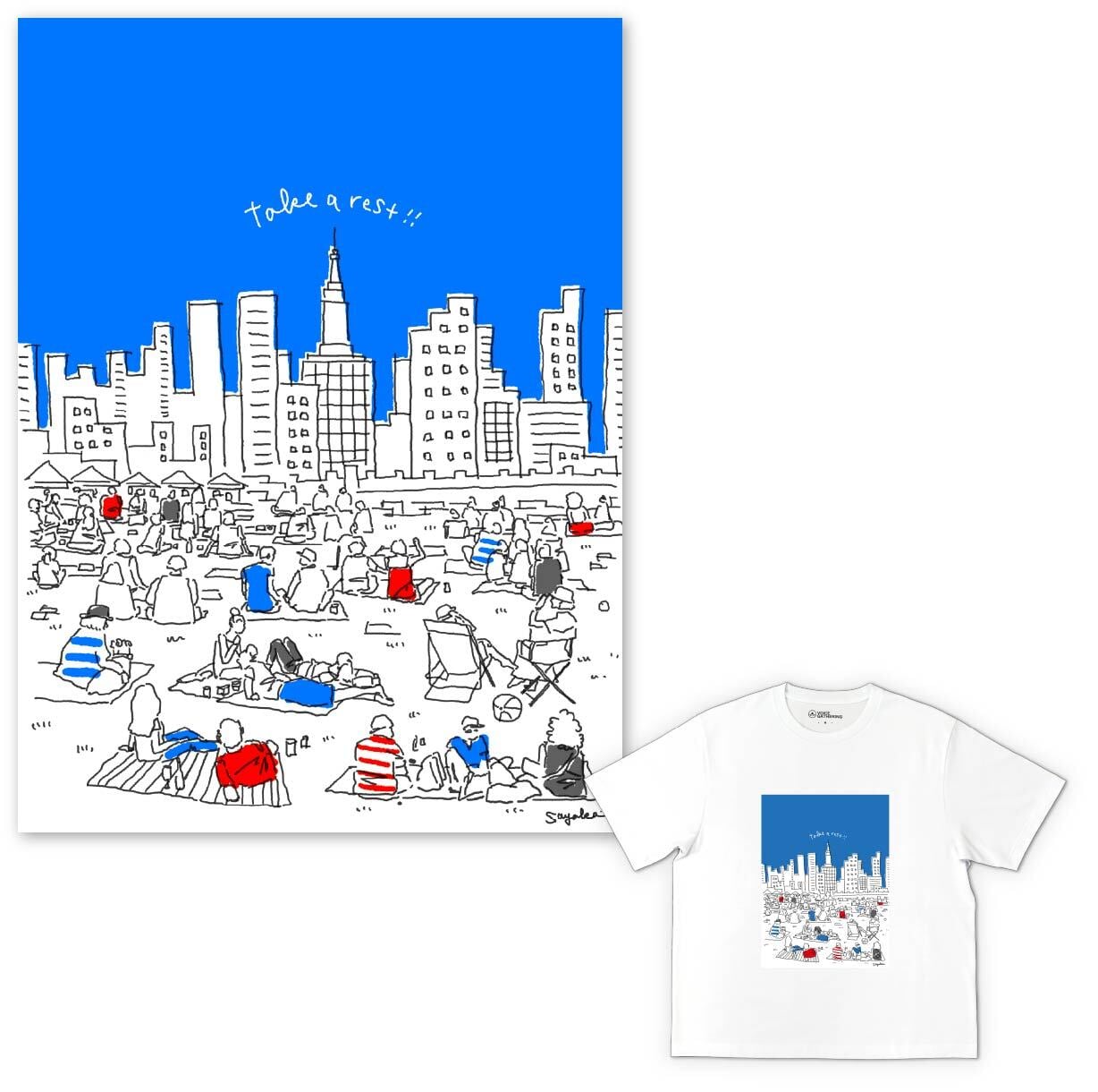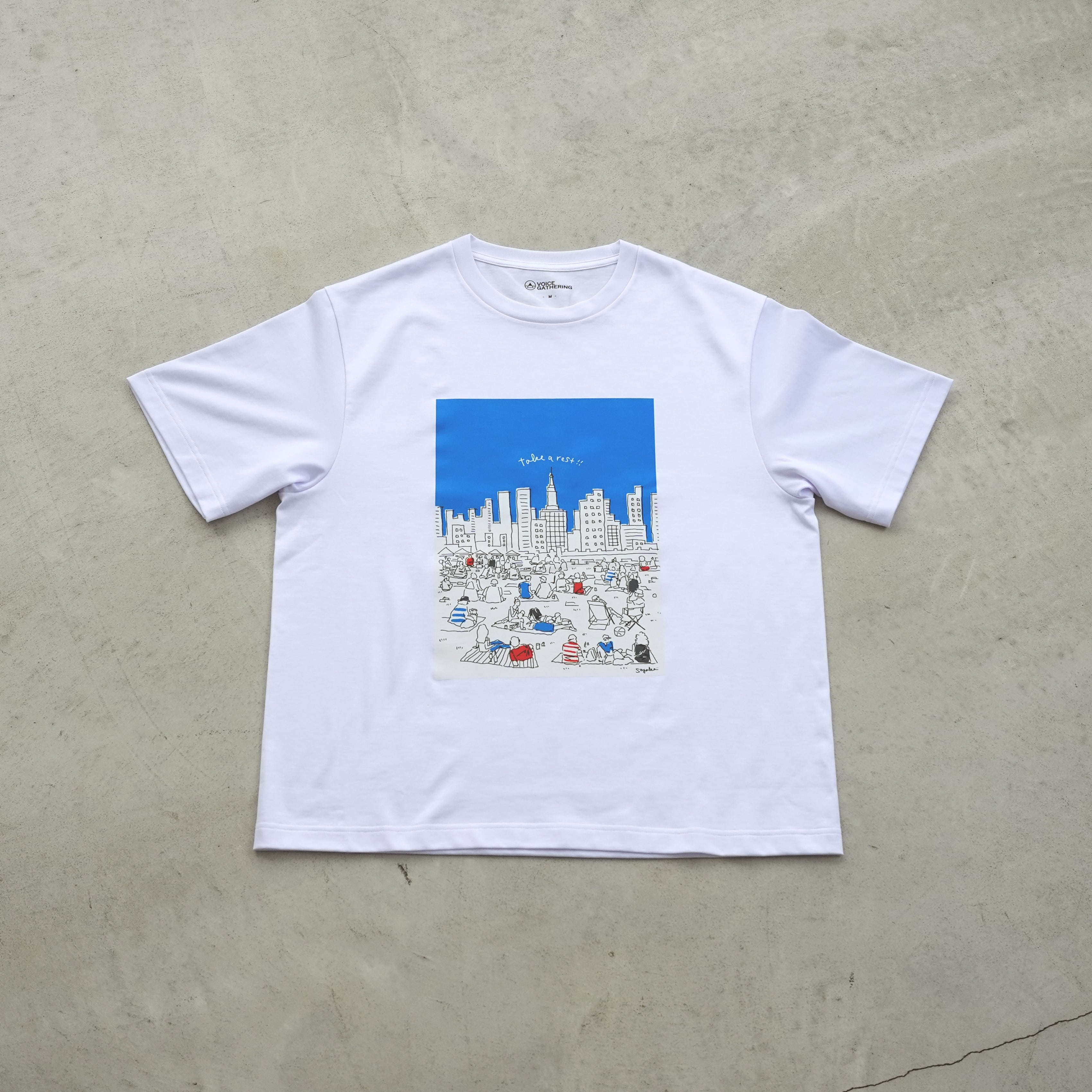 現代社会の働きすぎや情報過多から解放され、ゆっくりとした時間を大切にするメッセージを込めた絵です。人々が思い思いに過ごす様子を描き、急ぐことなくリラックスした時間を楽しむことの大切さを表現しています。