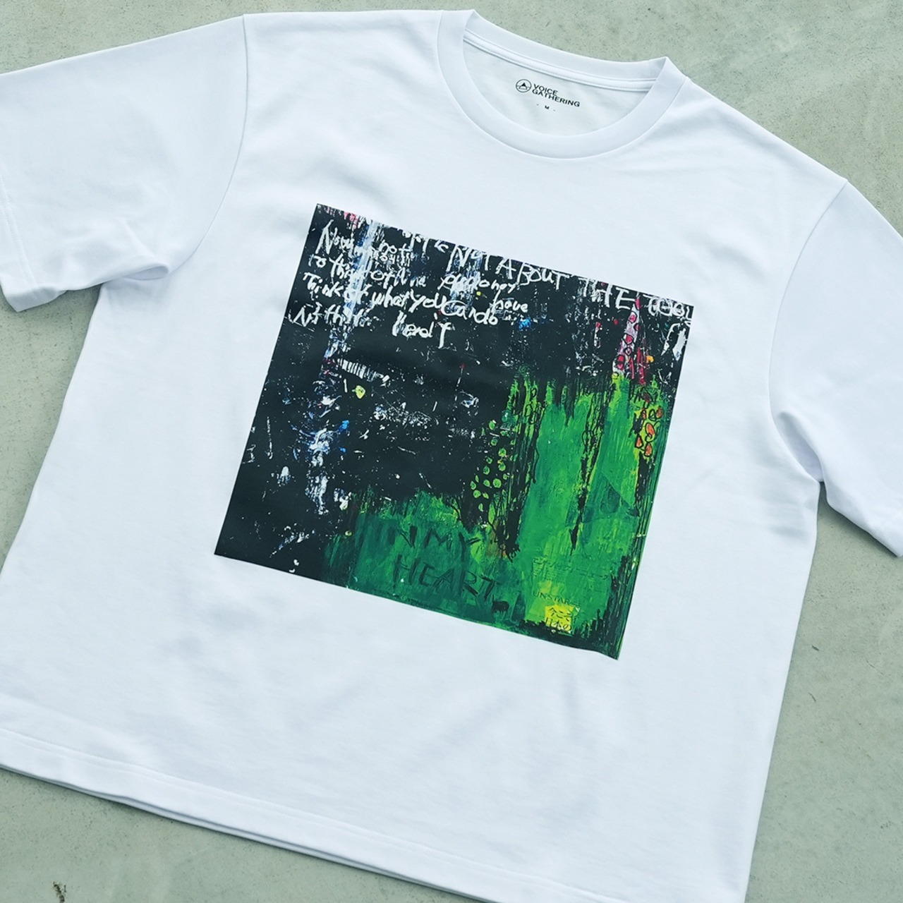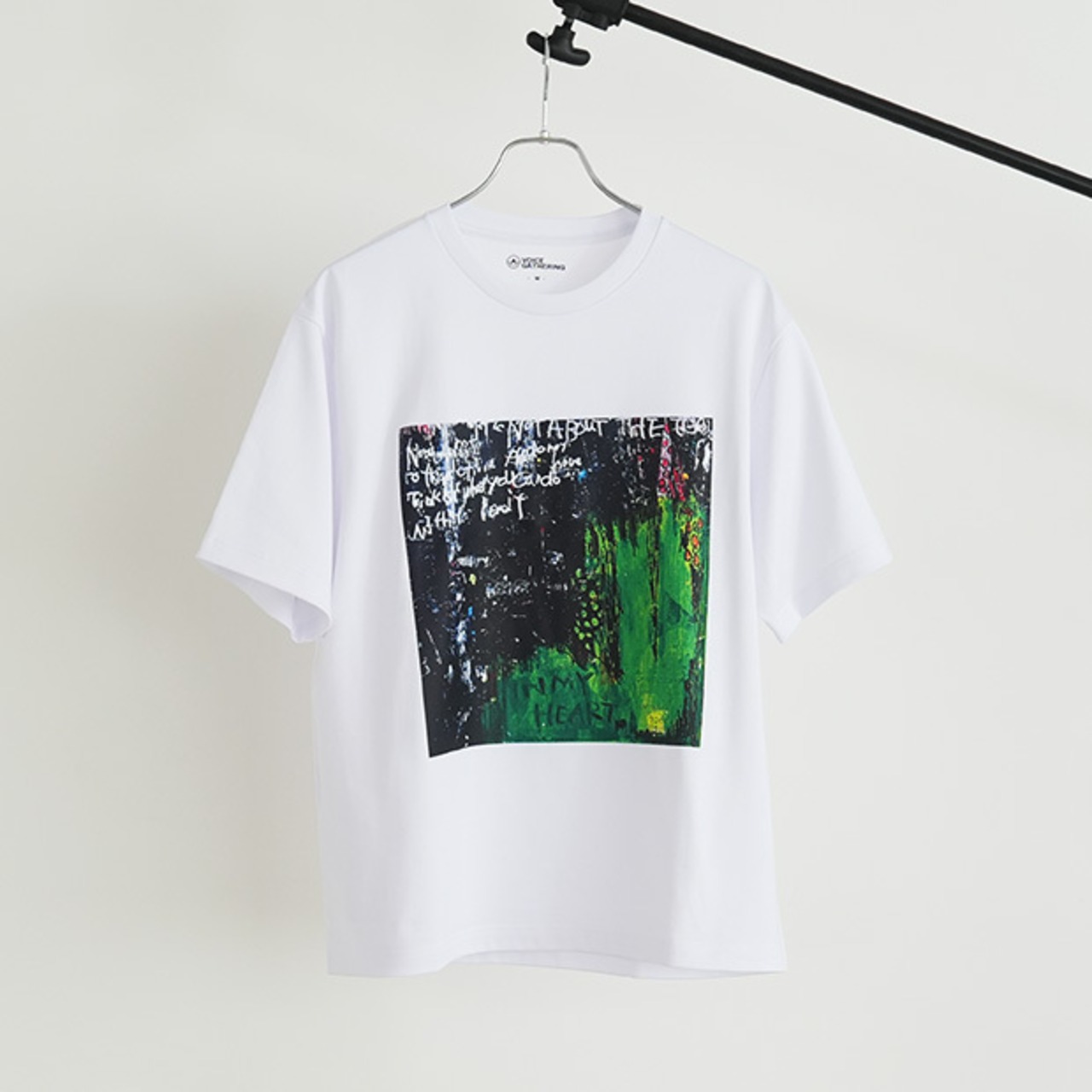 使い古された黒いビニールシートをキャンバスに、人間の奥底に潜む複雑で原始的な感情を、色彩と言葉(words)の層で力強く描き出す。自らの環境の残響として刻まれた、塗料の痕の上に、自分自身を奮い立たせ、湧き上がる言葉、色、質感を重ねていく。その行為は、過去から現在、そして一歩先の未来へと続く、心の軌跡の可視化である。