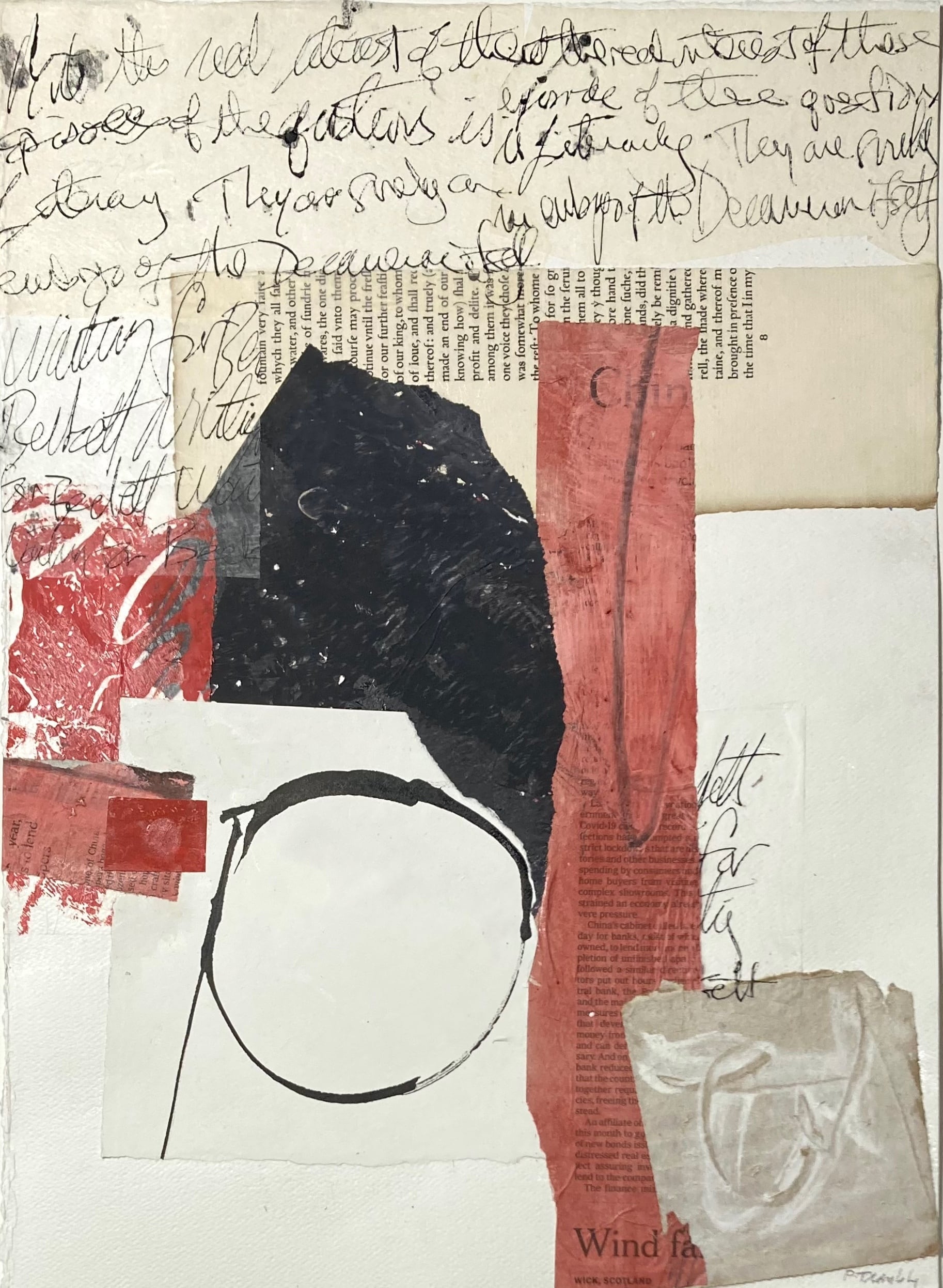 これは、水彩紙の上に制作された抽象的なミクストメディア・コラージュ作品で、サイズは縦15インチ、横11インチです。この作品は、印刷や描画が施された古書のページ、新聞紙、その他の紙類、そしてカリグラフィー的な要素など、さまざまな素材から構成されています。作品中に見られる文字や文章は、完成した作品において特定の「意味」を持つものではなく、全体の構成要素の一部として機能しています。