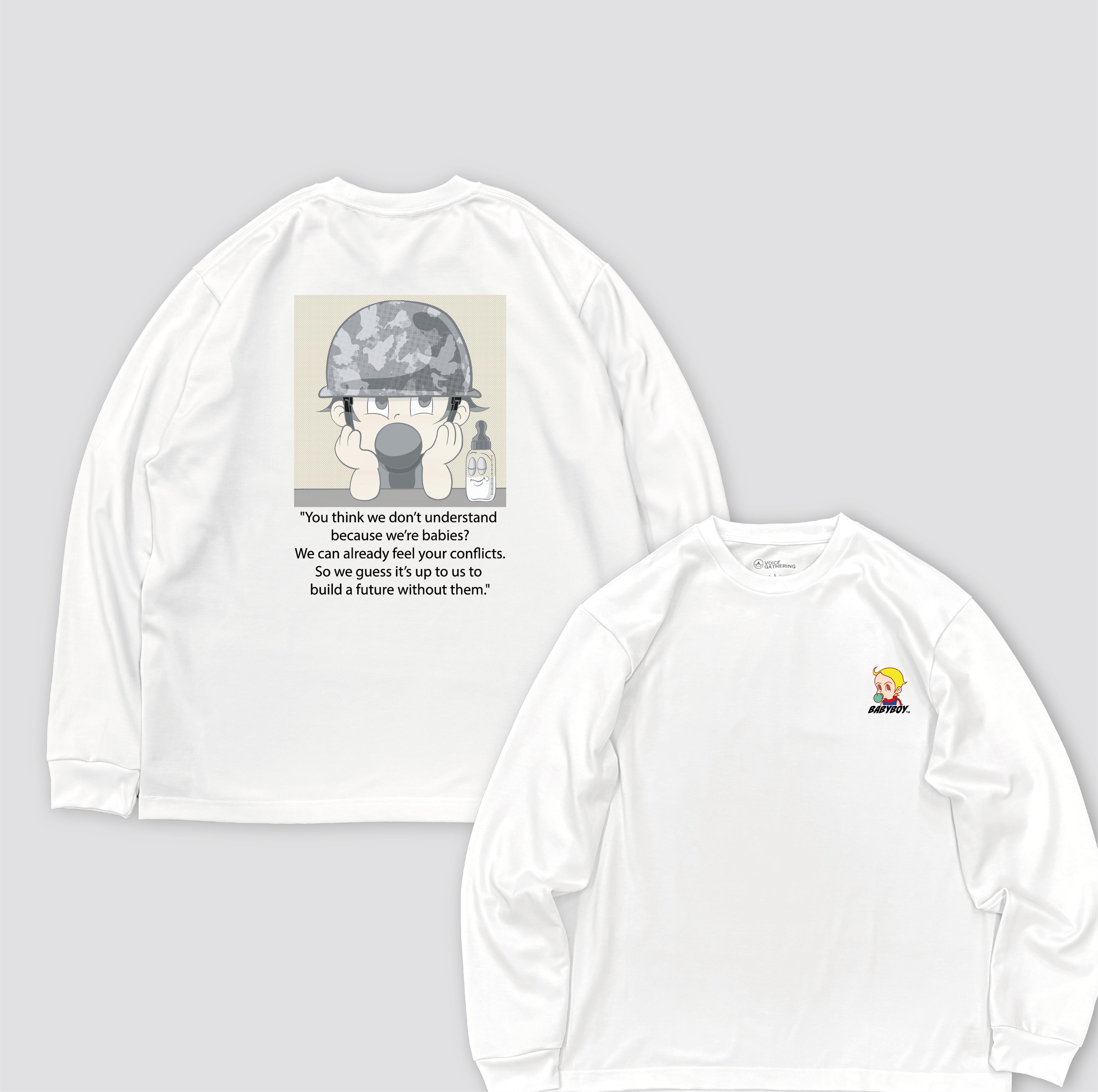 コロナ禍や戦争といった危機的状況下でも新たに生まれる命があり、その命が危機にさらされる現実に深い憂いを感じています。作品の中心にいる「BABYBOY」は、そんな今という時代に生まれた赤ちゃんのヒーロー。彼は“希望の象徴”であり、次世代の命を守るために立ち上がった“赤ちゃん戦士”という設定。このキャラクターを通じて、たとえ死の隣であっても産まれる命の尊さや未来への願いを描き出しています。