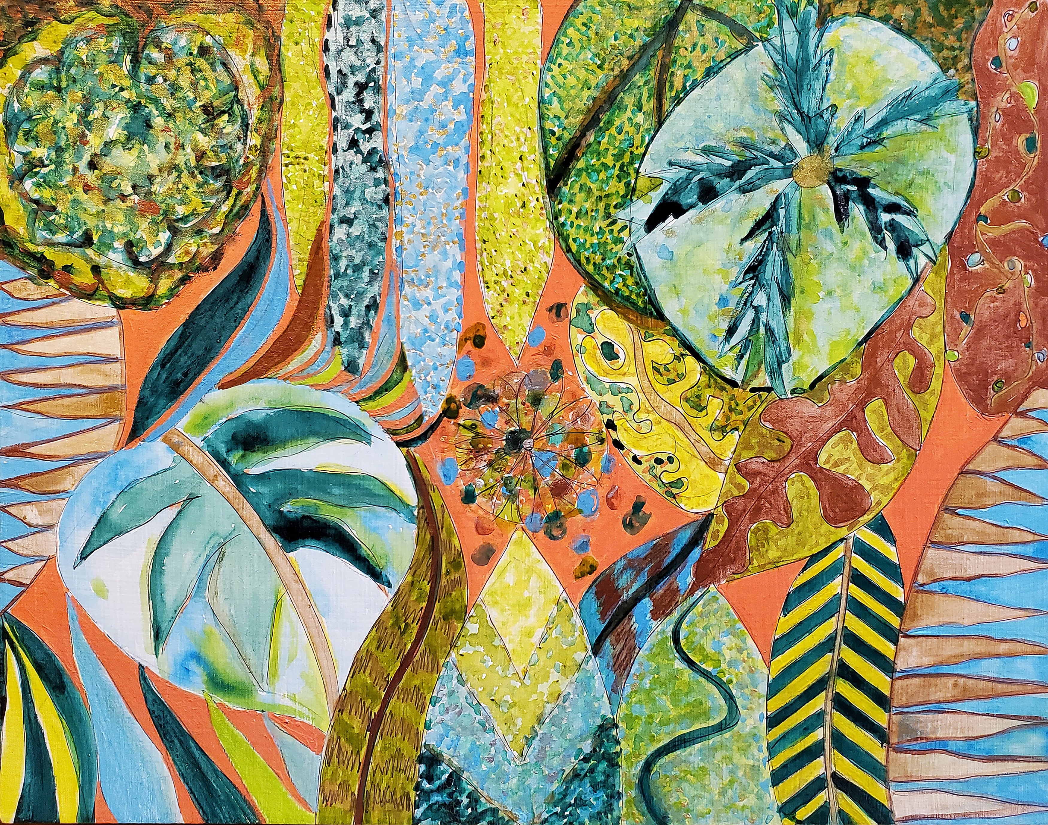 私の新作は「リーフ・バス(Leaf Bathing)」をテーマにしています。これは「森林浴(Forest Bathing)」の派生的な概念であり、日本における「自然と呼吸を共にする体験」──すなわち、植物のエネルギーを吸い込み、吐き出し、その過程で生まれるイメージや思考、感情に浸るという考え方に基づいています。《Coral Influenced Leaf Breath》では、観る者がこれらの感覚を意識的にも無意識的にも、多層的に体験できるような作品を目指しました。この試みによって、人間と自然との間により深く、意味のあるつながりを築くことを願っています。作品にはメタリックを含む水彩絵具を使用し、木製パネルまたは紙の上にイメージを描いています。