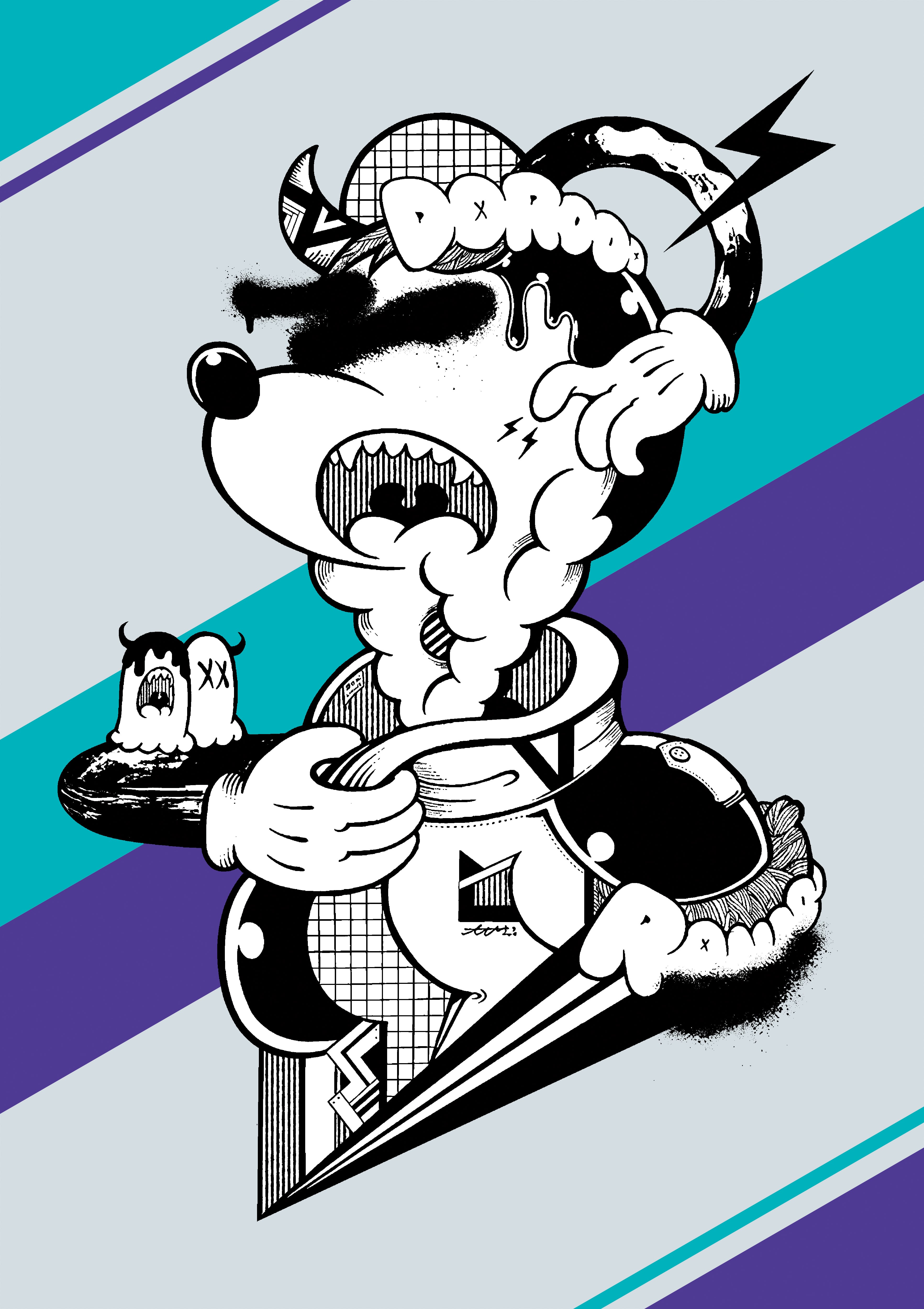 「ノイズ」や「欠けていくこと」をテーマに形と認識のズレ、情報や属性についての関係性をキャラクターを用いながら表現しています。過剰な情報の中で振り回され自分を見失っていく人やSNSなどで見られるような匿名性が持つ凶暴さ、意味を失い断片的になっていく言葉などをイメージしながら漫画や記号・グラフィティなどを組み合わせ、不確かで曖昧な形として再構成しています。