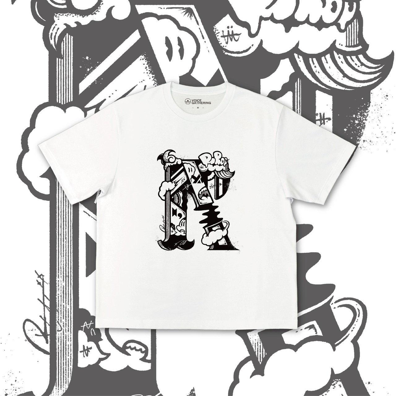 「ノイズ」や「欠けていくこと」をテーマに形と認識のズレ、情報や属性についての関係性をキャラクターを用いながら表現しています。過剰な情報の中で振り回され自分を見失っていく人やSNSなどで見られるような匿名性が持つ凶暴さ、意味を失い断片的になっていく言葉などをイメージしながら漫画や記号・グラフィティなどを組み合わせ、不確かで曖昧な形として再構成しています。