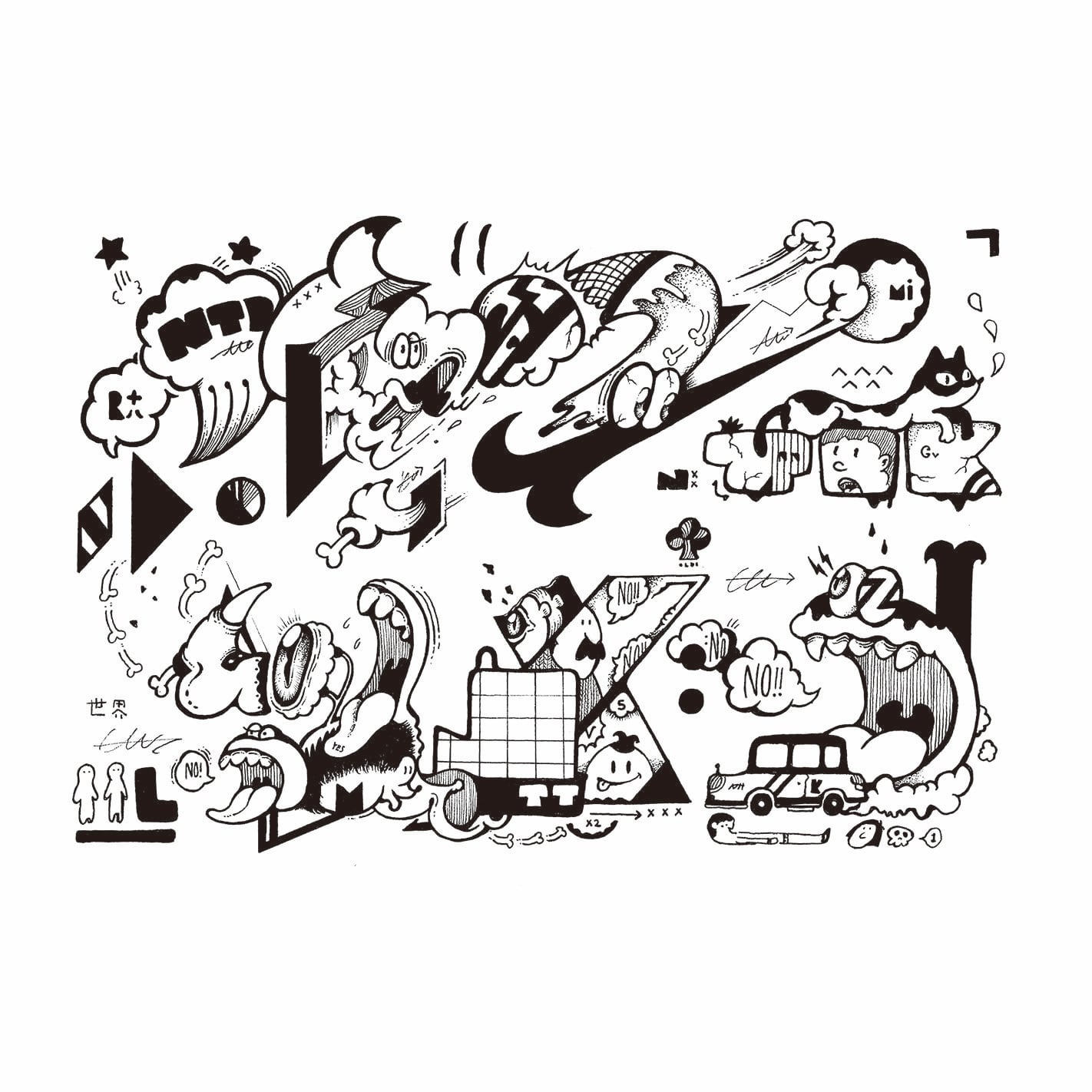 「ノイズ」や「欠けていくこと」をテーマに形と認識のズレ、情報や属性についての関係性をキャラクターを用いながら表現しています。過剰な情報の中で振り回され自分を見失っていく人やSNSなどで見られるような匿名性が持つ凶暴さ、意味を失い断片的になっていく言葉などをイメージしながら漫画や記号・グラフィティなどを組み合わせ、不確かで曖昧な形として再構成しています。