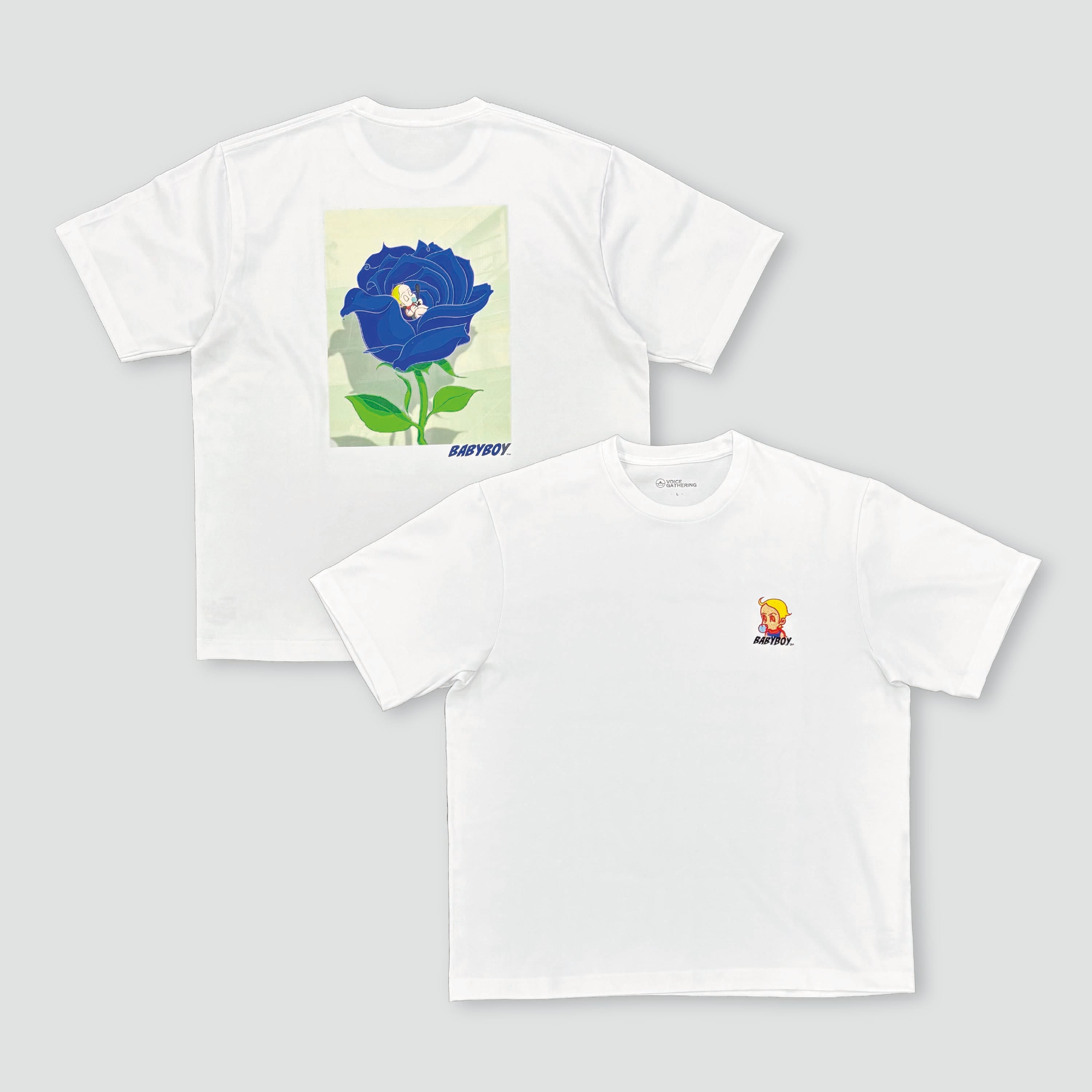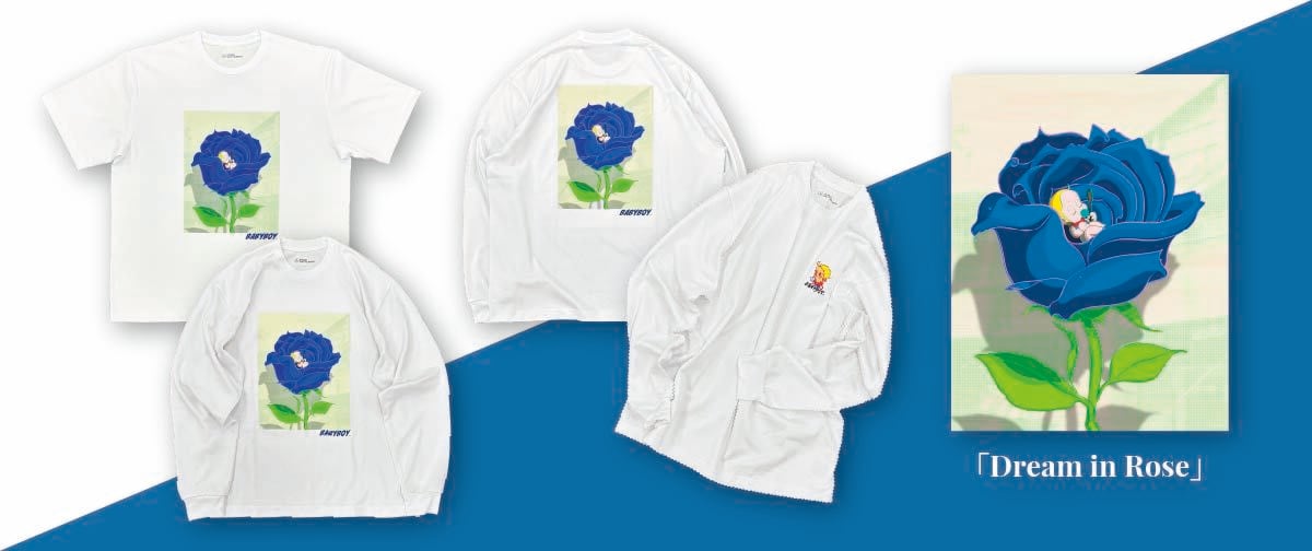 メインビジュアル「NEO(n) YEAR -unicorn-」は、干支の午年に因んでいるだけでなく、新年に相応しいBABYBOYの見せ方に拘りました。これまで厄災の中で“武器”を手に戦いを連想させるシーンを描くことが多かったのですが、今回はもう少しポジティブに、平和をもたらす使者的なイメージを意識しました。真実/幸運/神聖さなどを象徴するユニコーンにまたがる事で新年に始まる神話のプロローグのような感じ。一方、「Dream in Rose」で描く青いバラは、神話の誕生のイメージ。ブルーローズは花言葉では「奇跡」を意味します。大病からの復帰・再誕した私自身をオマージュしながら、この新年に新たに誕生するBABYBOYを描きだした、という…現時点ではそんな位置付けのシリーズとして仕上げています。